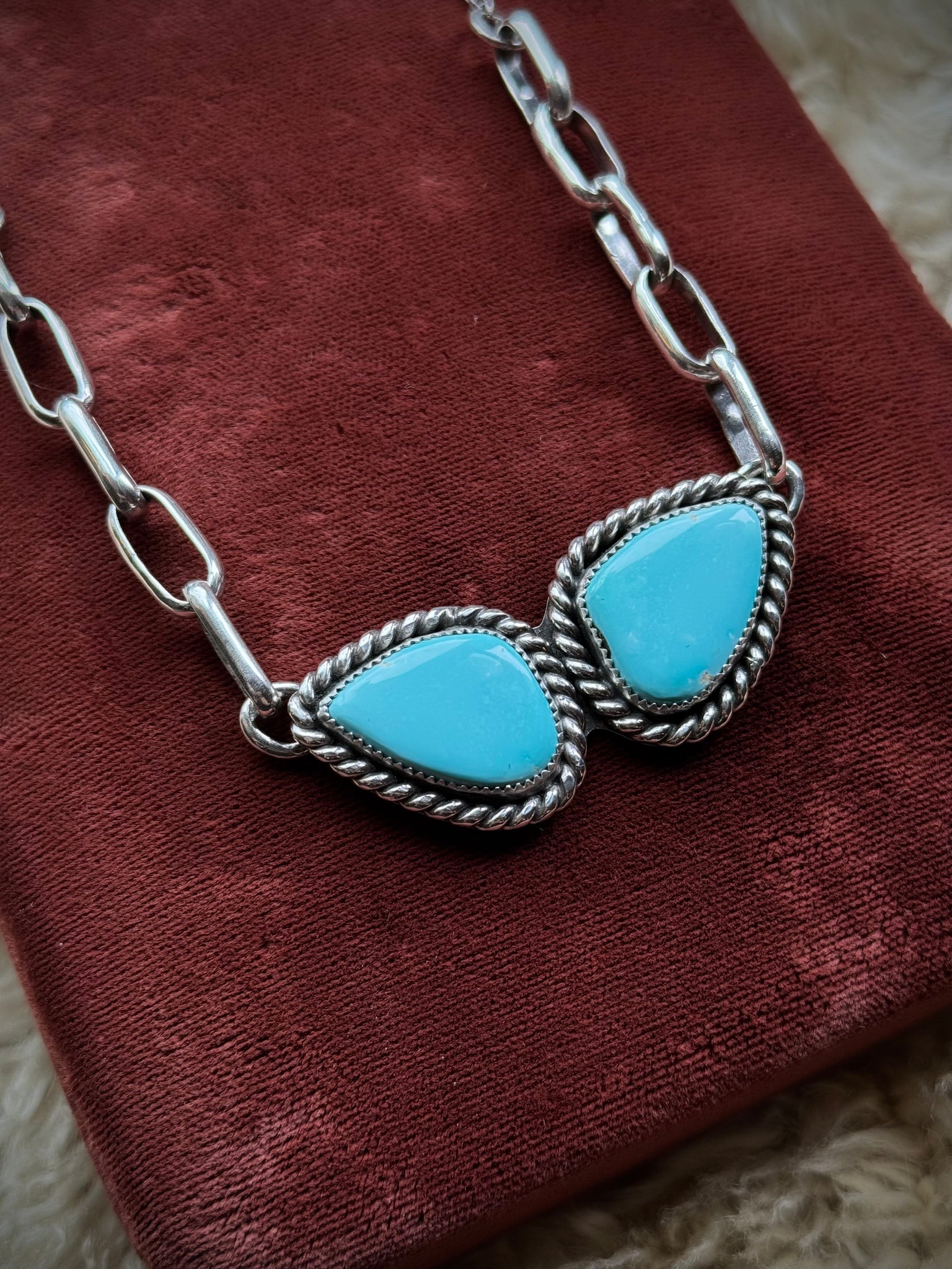2 chunky Royston stones set in a heavy rope border on a part handmade paperclip chain.