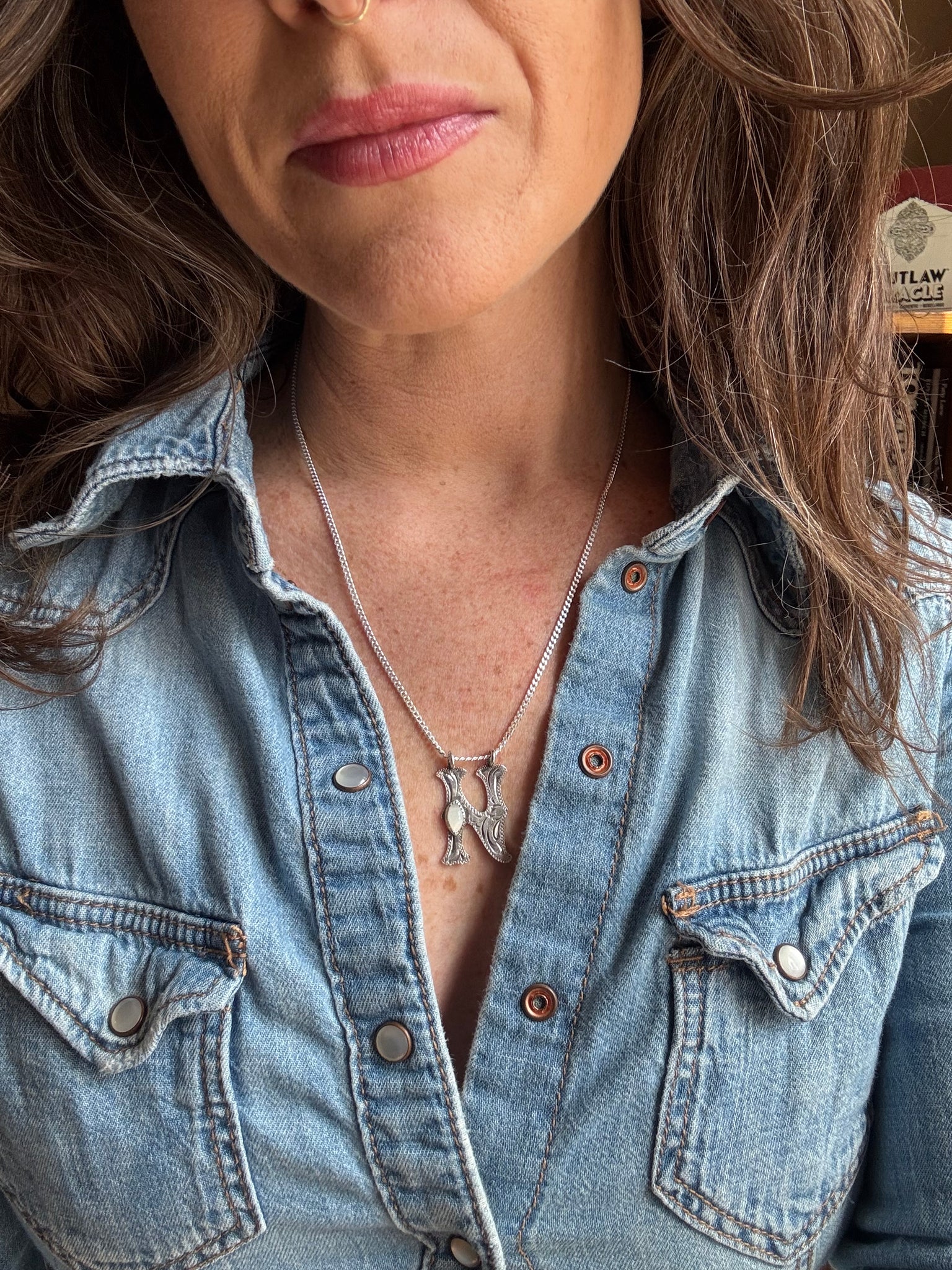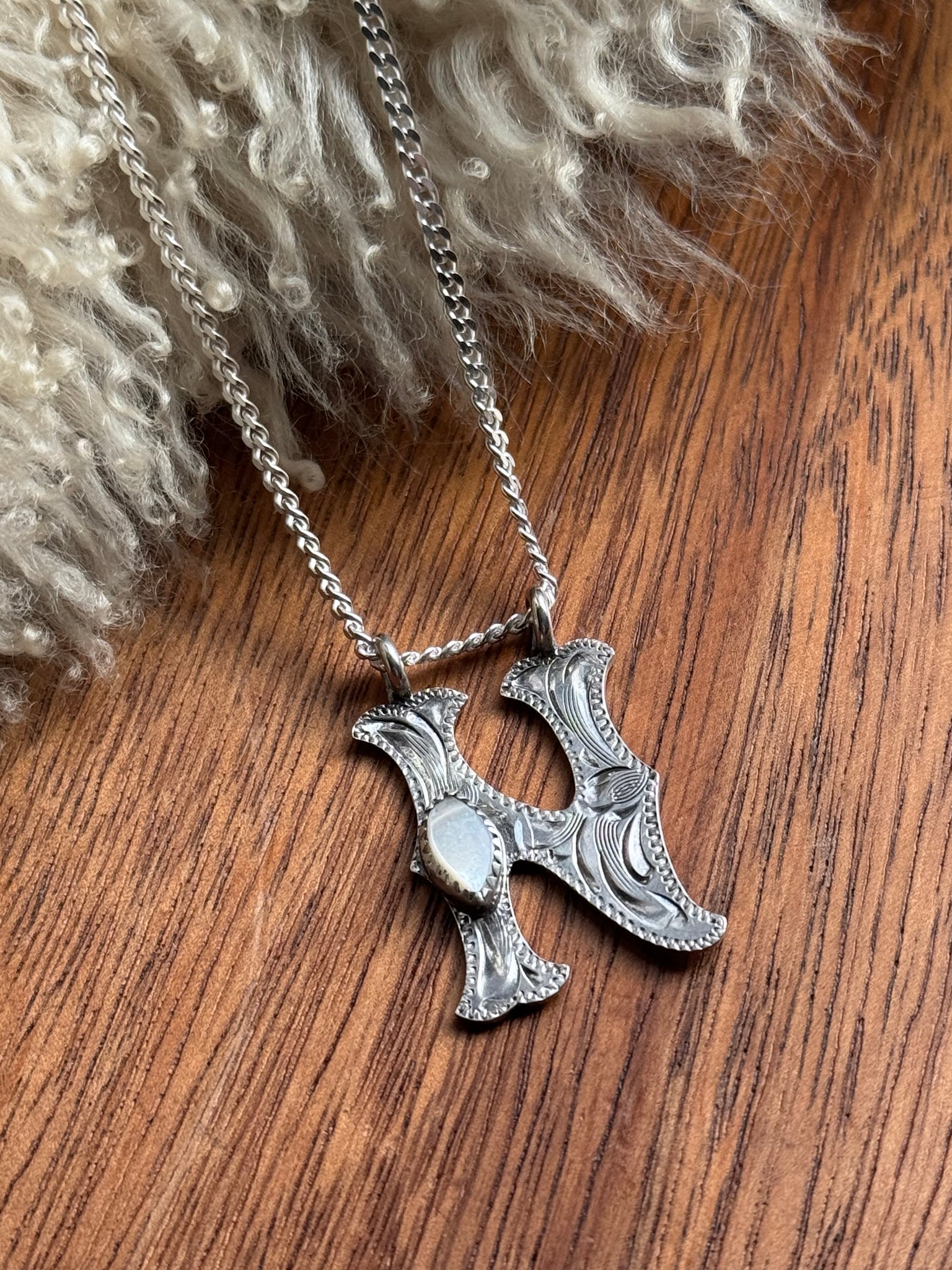 Set with a Mother of Pearl stone on a 19” sterling silver curb chain.