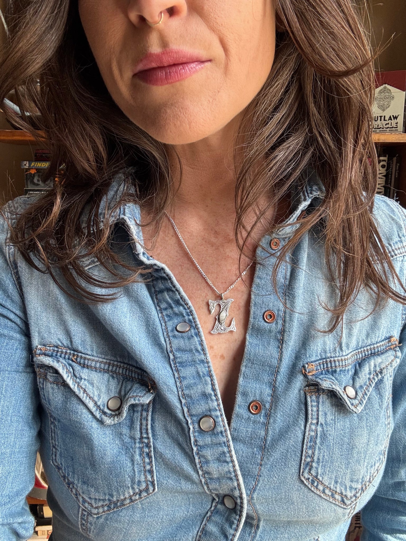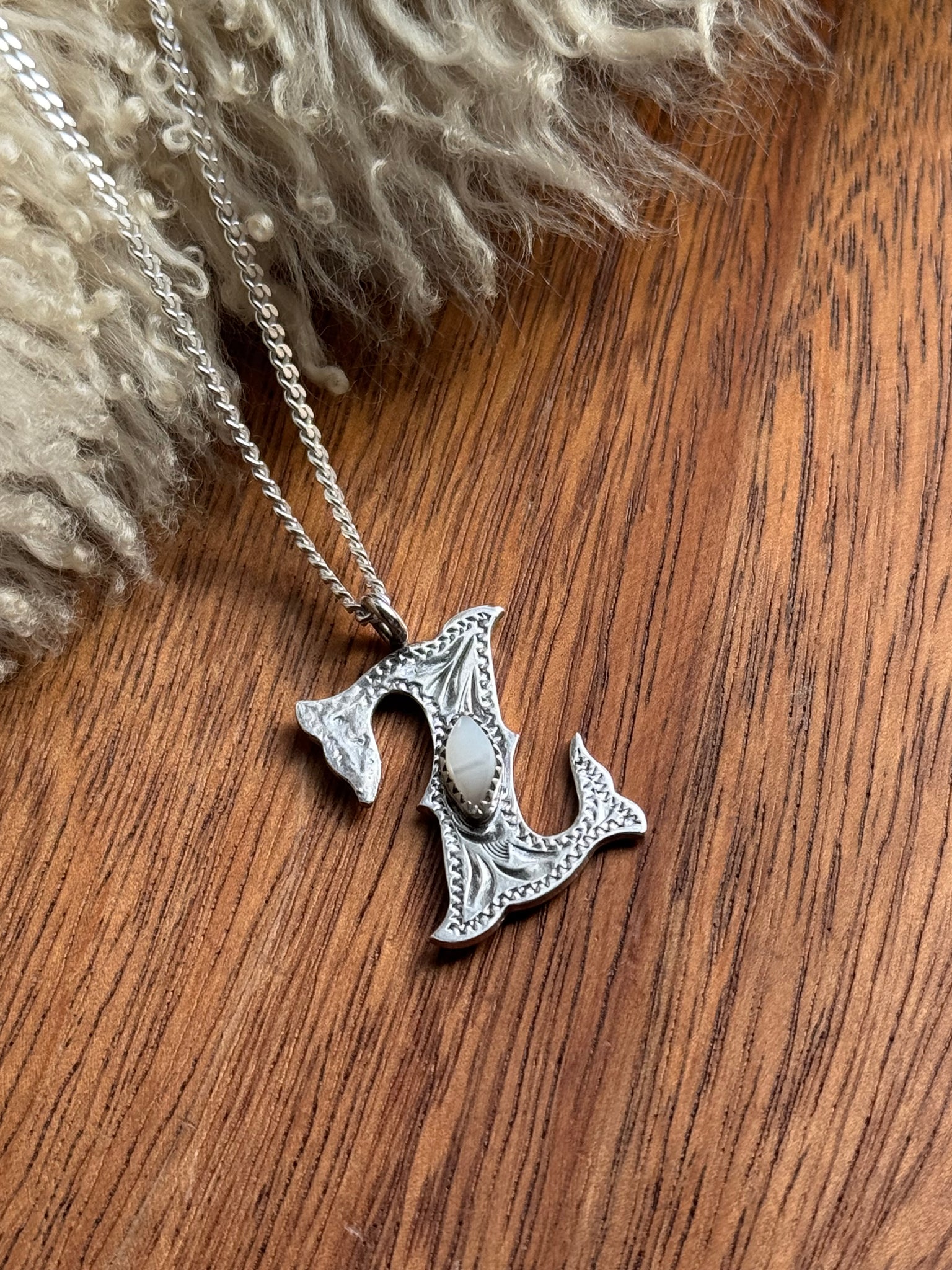 Set with a Mother of Pearl stone on an 18” sterling silver curb chain.