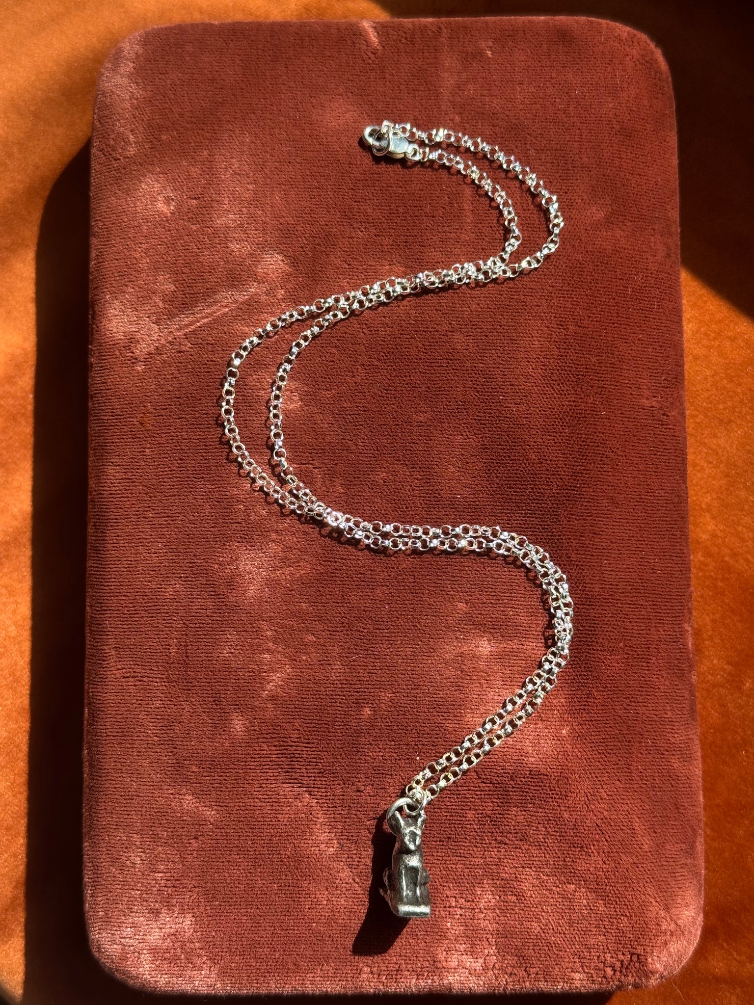 Charm hangs .75” on an 18” sterling silver rolo chain.